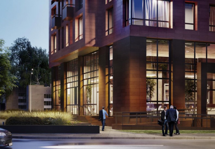 Проектом предусмотрено строительство 19-этажного здания с тремя подземными этажами. Тип дома – монолитно-кирпичный. Цоколь фасада и стены 3-19 этажей облицуют плиткой из керамического покрытия, первые два этажа – натуральным камнем.